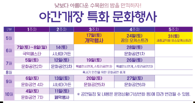 - 그 외에도 국악, 클래식 등 다채로운 문화 공연이 펼쳐져요.