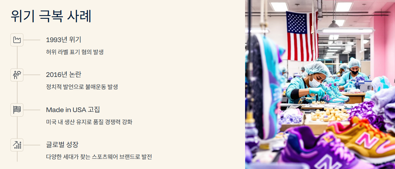 뉴발란스는 1993년 허위 라벨 표기 혐의와 2016년 정치적 논란으로 위기를 겪었습니다. 특히 2016년에는 대표의 발언이 트럼프 지지처럼 해석되면서 불매 운동까지 일어났죠. 하지만 뉴발란스는 이러한 난관을 지혜롭게 극복했습니다.