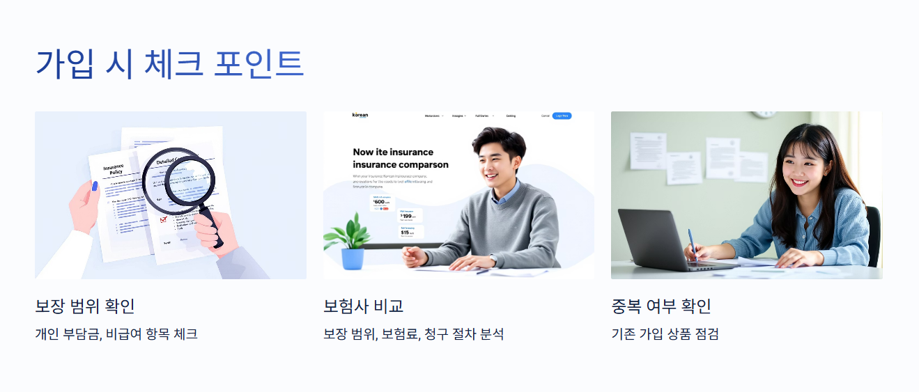 실손보험 가입 시에는 보장 범위, 개인 부담금, 비급여 항목 등을 꼼꼼히 살펴봐야 해요.
