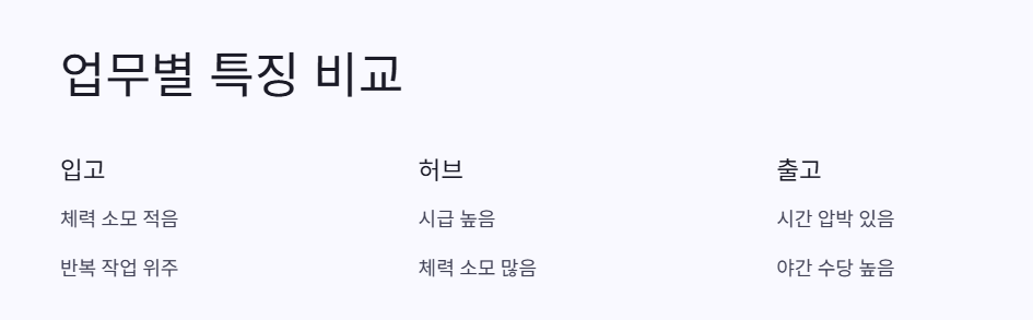 허브 물량 분류나 상하차 작업은 시급이 높지만, 체력적인 부담이 크다는 의견이 많습니다.