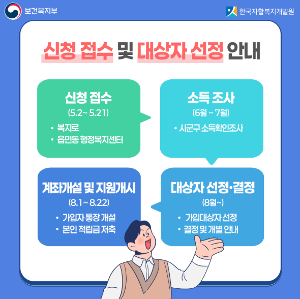 청년내일저축계좌는 신청만 하면 바로 가입되는 게 아니라, 정부가 소득과 재산 조건을 하나하나 심사한 뒤 선정 결과를 알려주는 방식이에요.