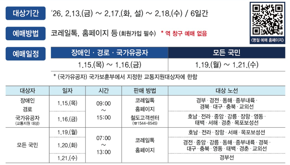 대상자 예매일 시간 예매 방법장애인·경로 1월 15일(목) 09:00~15:00 코레일톡 앱, 코레일 홈페이지 국가유공자 1월 16일(금) 09:00~15:00 전화예매 ☎ 1544-8545 (ARS 전용) ※ 사전 등록된 교통지원 대상자만 예매 가능